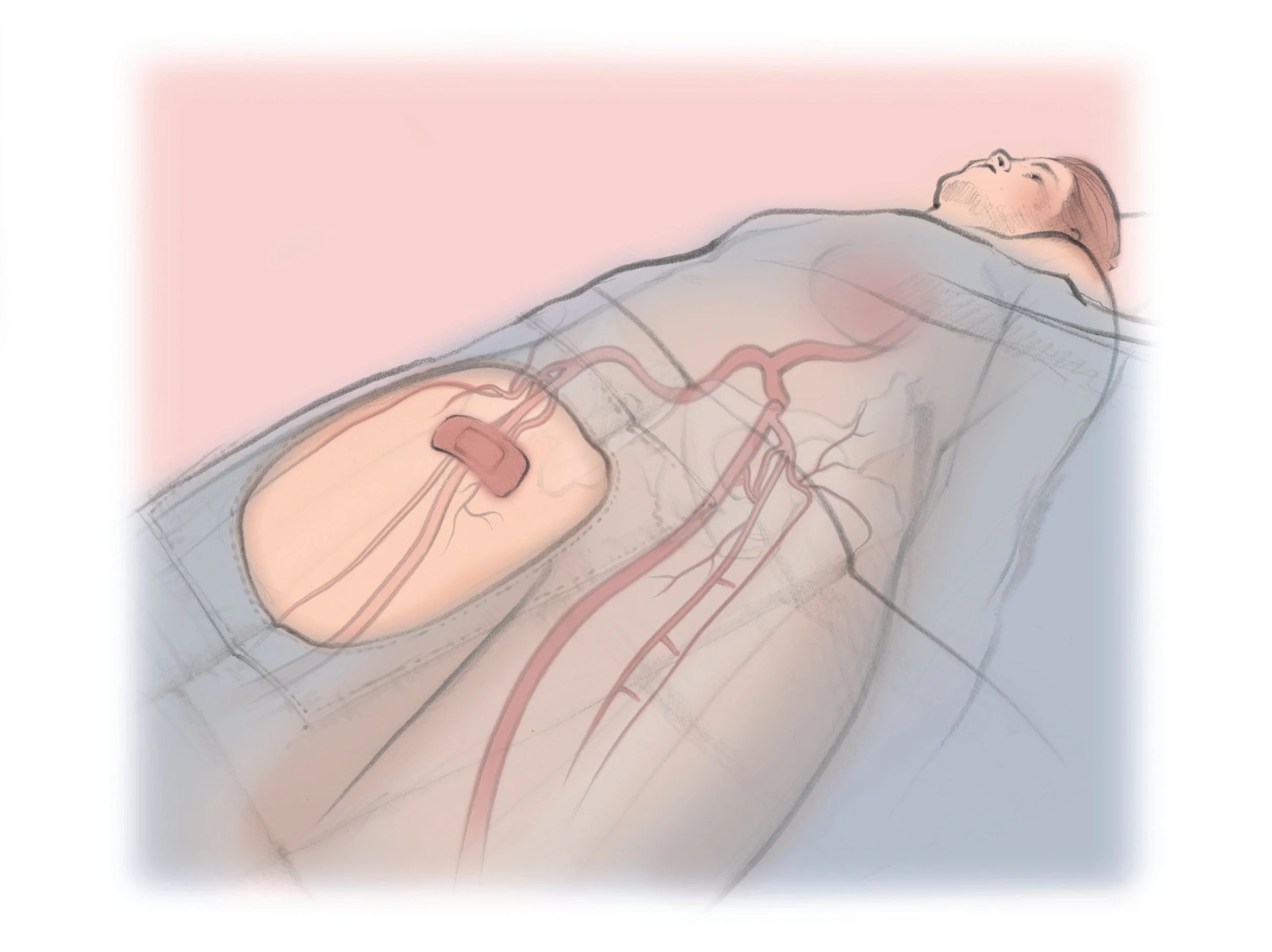1. After numbing the skin, the clinician threads a small tube into a blood vessel at the top of the thigh (shown) or wrist.